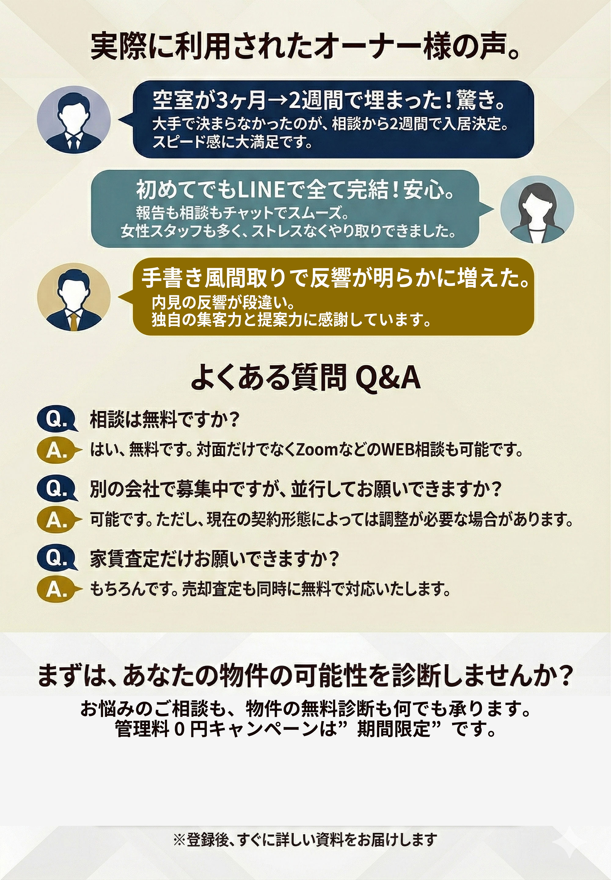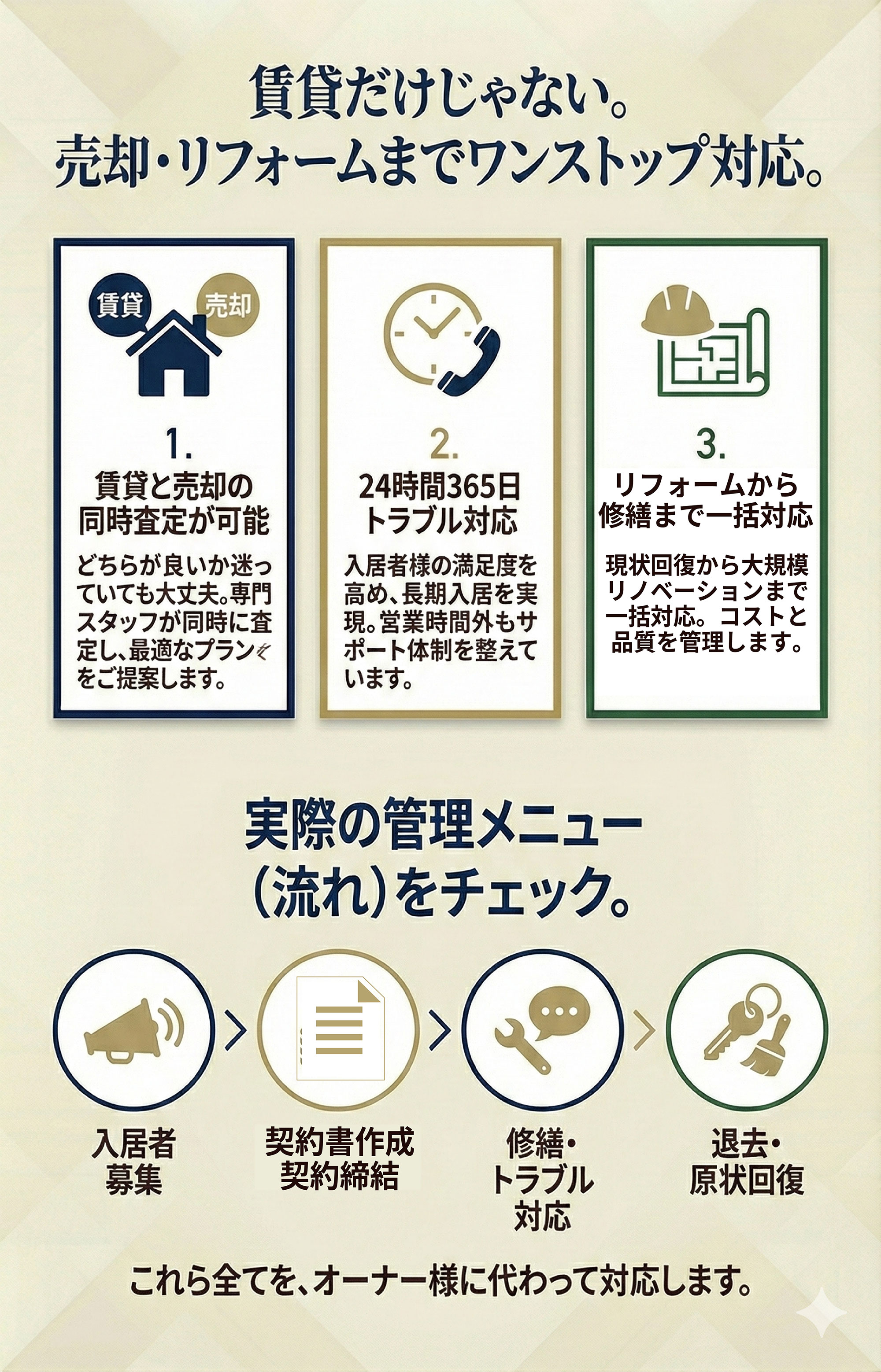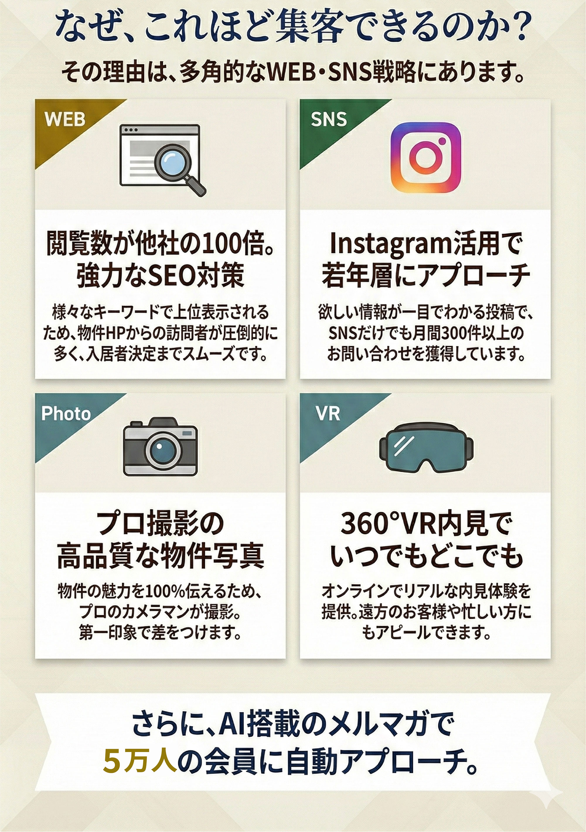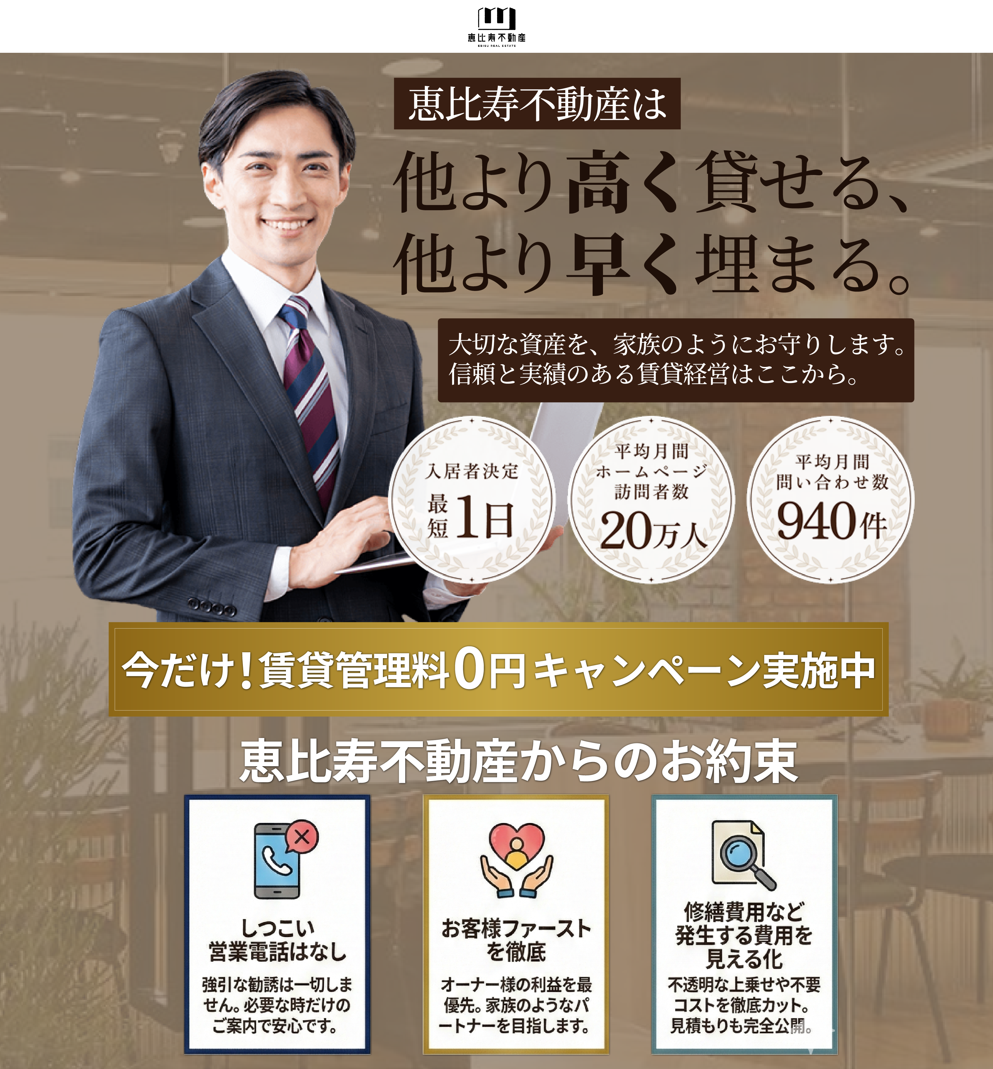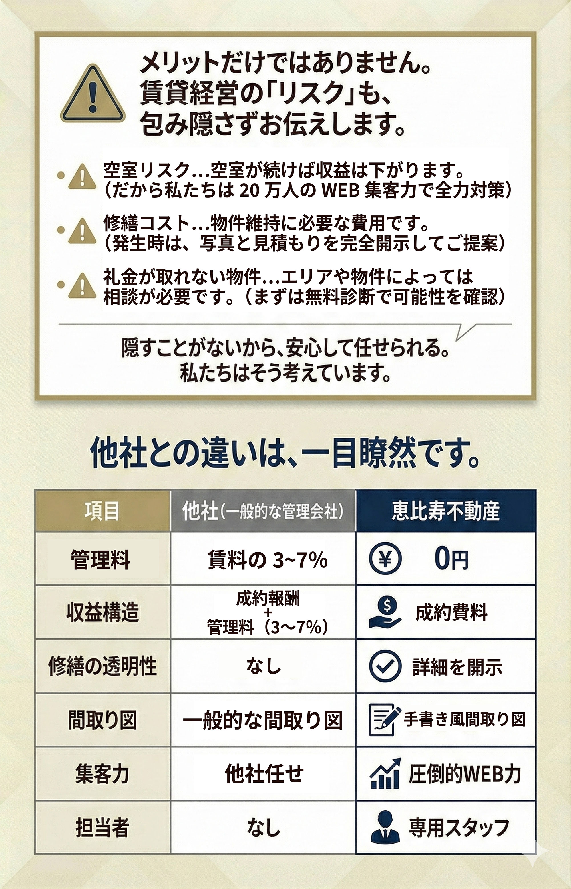当社は経営基本方針にのっとり、優れた物件とサービスをお客様にご提供するとともに「誠意ある接客」に徹する事で、お客様の満足と信頼を得ることを目指しています。そのために、お客様はもちろんのこと、取引業者、大家様、従業員など数多くの方々と、より良い関係を築いていきます。この一環として、個人情報を適切に保護し、取り扱うために、次の取り組みを実施いたします。